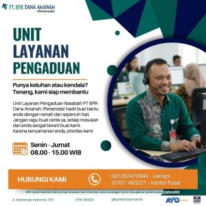 Punya pertanyaan, keluhan, atau membutuhkan bantuan? Tim kami siap melayani Anda dengan cepat, ramah, dan profesional. PT. BPR Dana Amanah (Perseroda) Jl. Maharaja Indra No. 397 Pangkalan Kerinci, Kabupaten Pelalawan, Provinsi Riau Telp. 0761 – 493321 Email : dana_amanahbpr@yahoo.com🕒 Jam Operasional Senin – Jumat 08.00 – 15.00 WIB Layanan Pengaduan Nasabah Kami menerima dan menindaklanjuti setiap pengaduan dengan serius dan profesional.Sampaikan kendala atau masukan Anda, dan tim kami siap membantu.